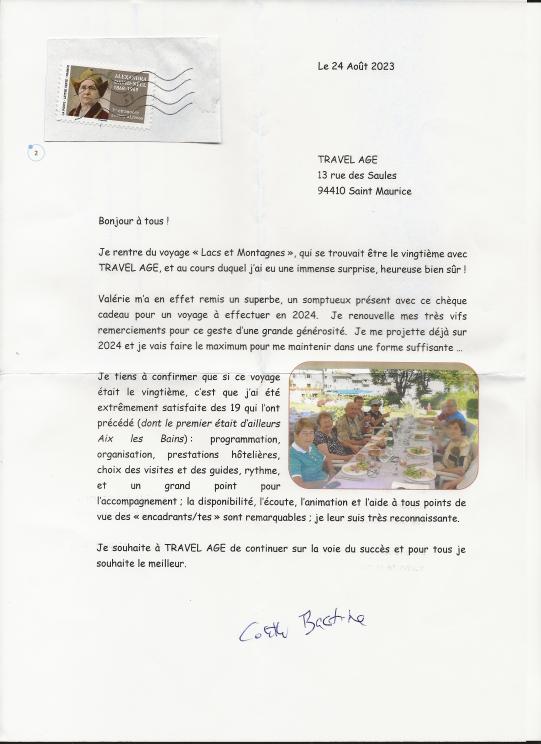 ..." Un grand merci pour ce beau voyage inoubliable "... Annie, 87 ans, Paris (75)